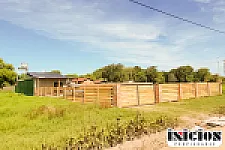 Cerramiento completo con portón de madera y estructura de ladrillo, con acceso para vehículos.