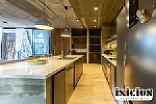 Al ingresar, una imponente puerta de madera nos conduce a un amplio espacio integrado que reúne el living, el comedor y la cocina, separada por una generosa mesada que aporta funcionalidad y diseño.