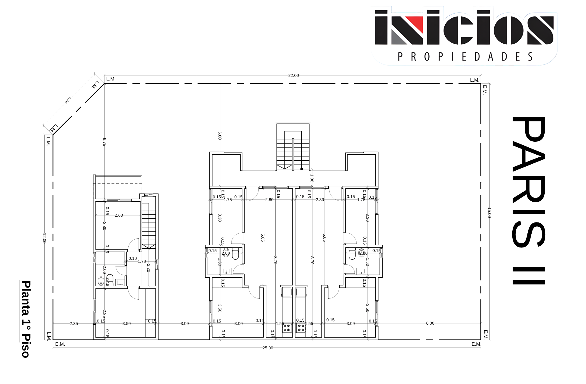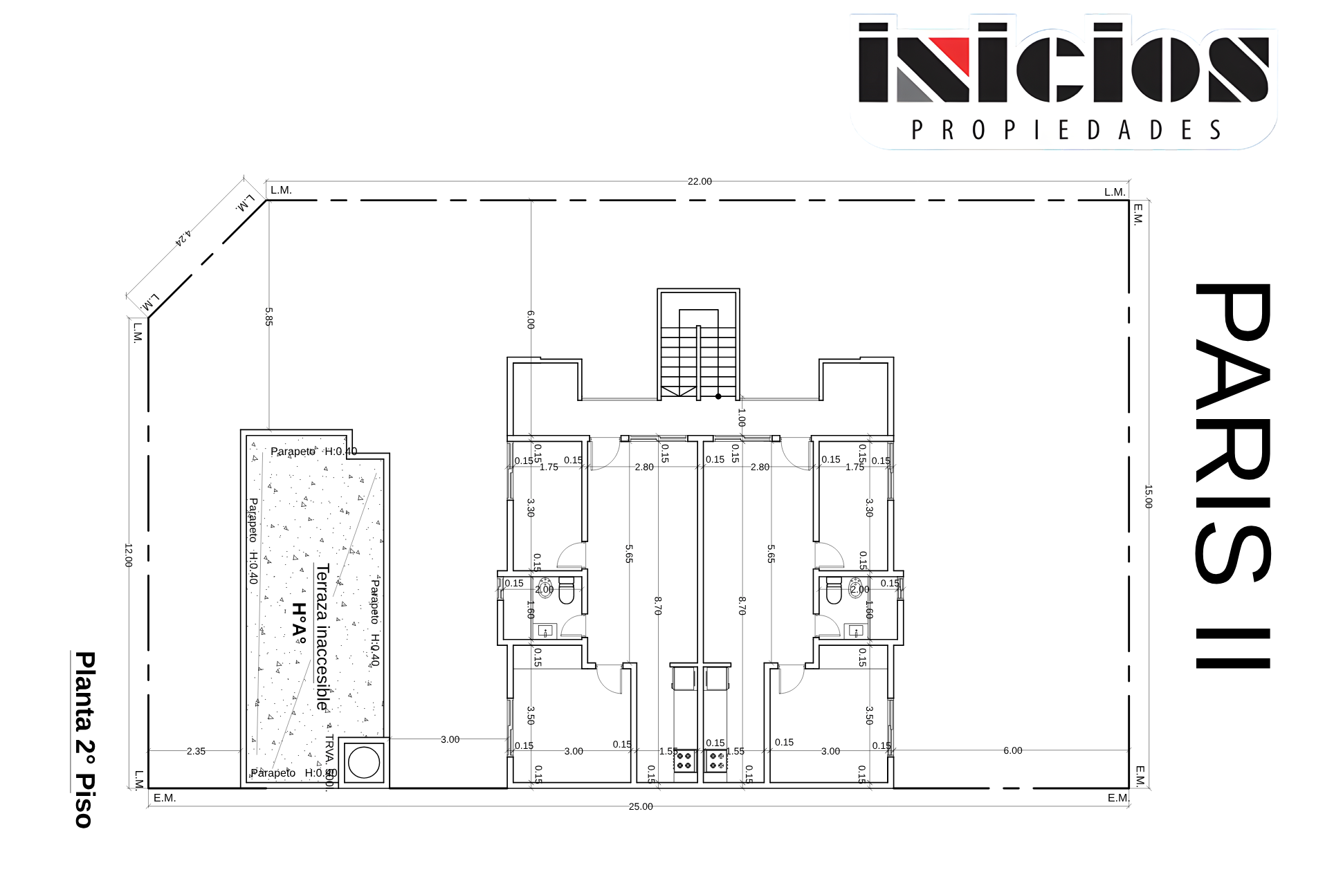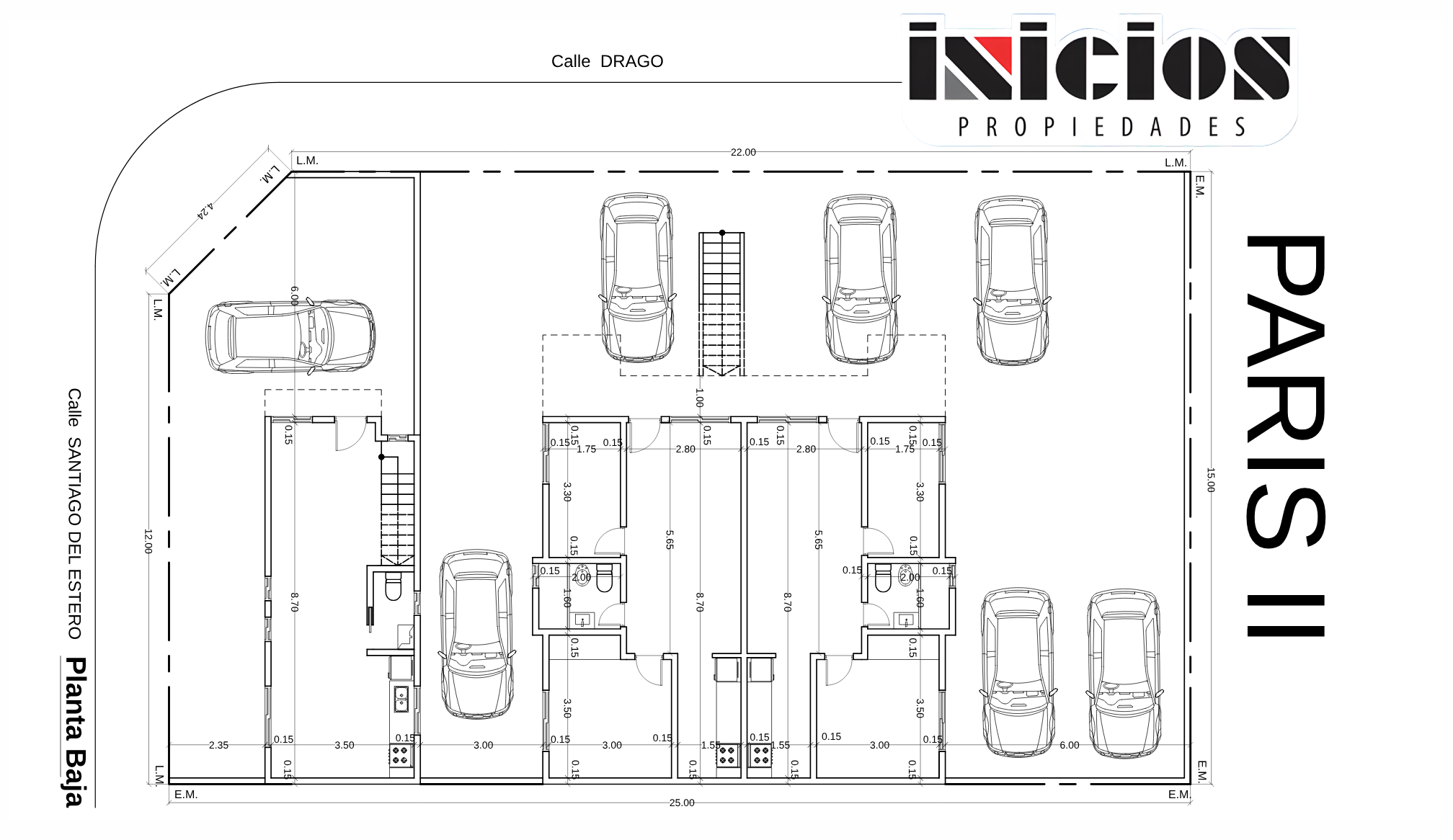 Paris II: complejo residencial, compuesto por seis unidades funcionales. En la esquina se destaca un dúplex independiente, mientras que en la parte interna del complejo se encuentran seis departamentos de dos ambientes.
